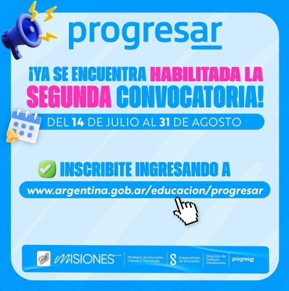 La Subsecretaría de Educación de Misiones, a través de la Dirección de Políticas Estudiantiles, recuerda a la comunidad educativa misionera que está disponible, desde el 14 de julio y hasta el próximo 31 de agosto, la inscripción para la segunda convocatoria del año a las Becas Progresar. Los interesados podrán anotarse a cualquiera de las líneas del programa: Progresar 16 y 17 años, Progresar Obligatorio, Progresar Superior, Progresar Enfermería y Progresar Trabajo.